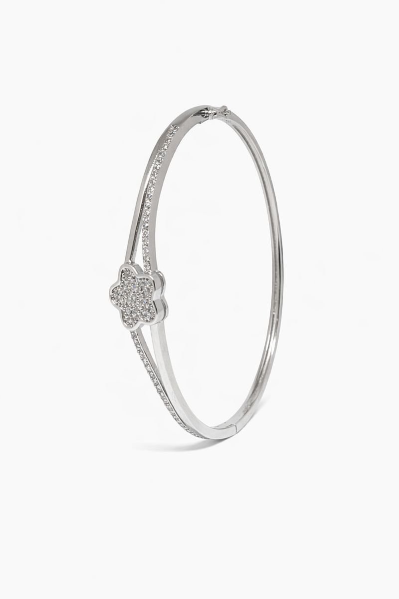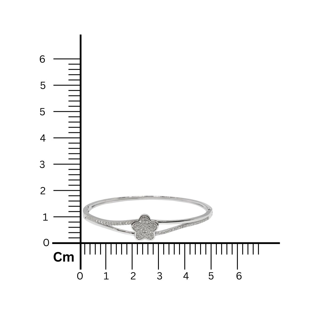 Celebrate feminine elegance with this delightful 925 Sterling Silver bangle. The focal point is a sparkling five-petaled flower (or star) motif, densely set with White American Diamonds. The bangle features a stylish split-shank design, where the polished silver band divides into two graceful curves leading to the centerpiece, accented with a row of pave stones for added shimmer. Equipped with a secure hinge and clasp mechanism, this bracelet offers both beauty and ease of wear. Weighing 10.04 grams, it is a perfect accessory for daily elegance or light festive occasions.