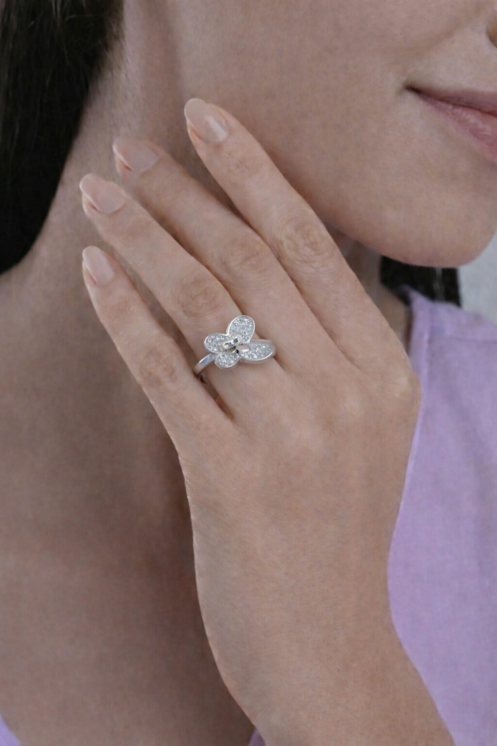 Bloom with elegance wearing this charming 925 Sterling Silver flower ring. The design features a stylized three-petal floral or butterfly motif, where each petal is intricately encrusted with shimmering pave-set White American Diamonds, surrounding a unique central stone. Weighing 2.91 grams, this feminine and graceful piece brings a touch of nature-inspired beauty to your everyday style.