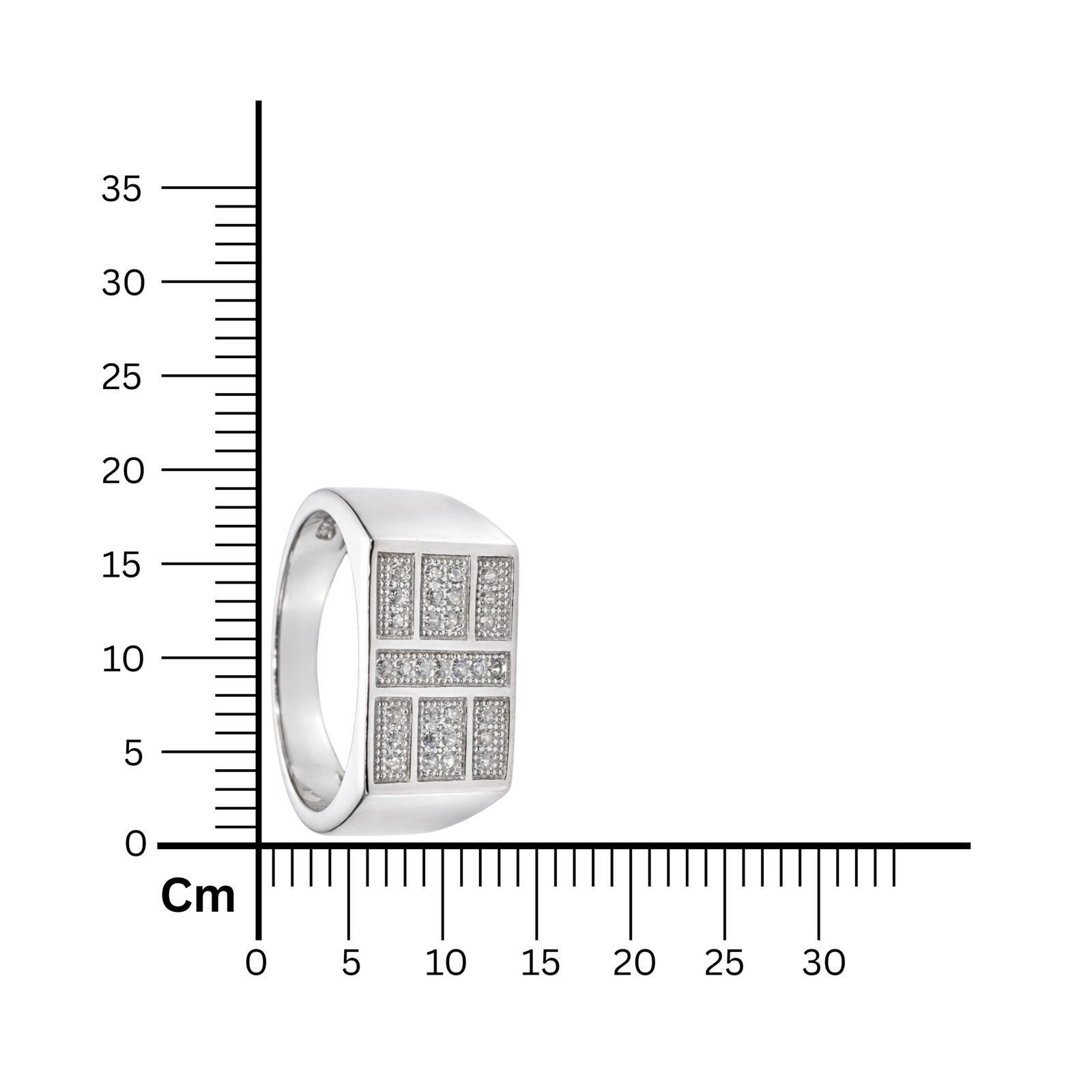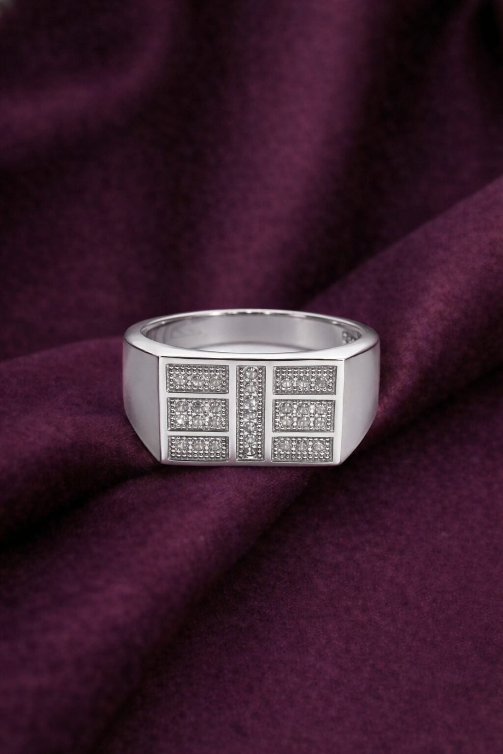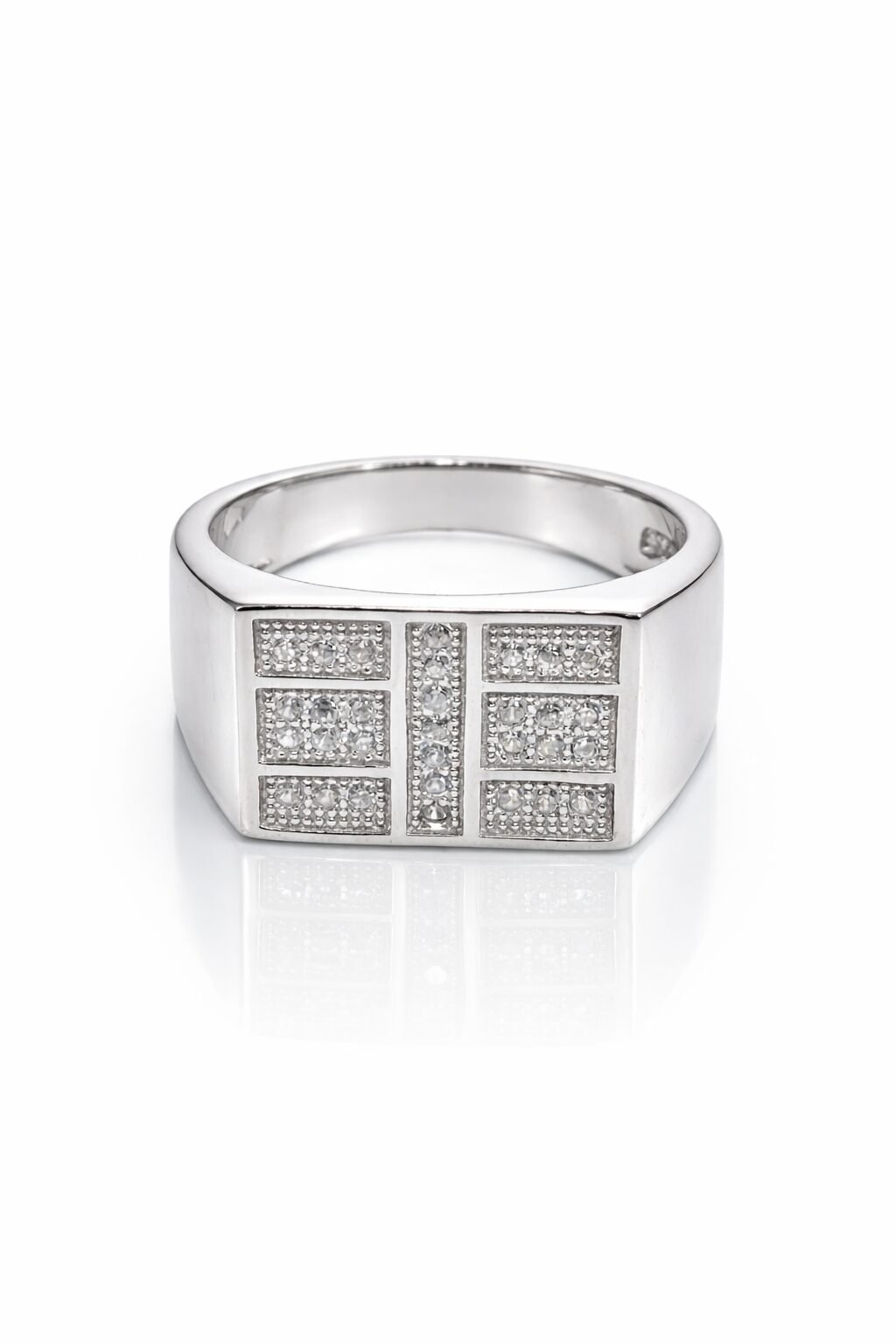 Upgrade your style with this structured and masculine 925 Sterling Silver ring. The design features a bold rectangular face with a geometric grid pattern, where distinct sections are meticulously detailed with sparkling White American Diamonds and separated by polished silver bars. Weighing 5.81 grams, this broad ring combines modern architecture with timeless shine, making it an excellent choice for daily wear or special occasions.