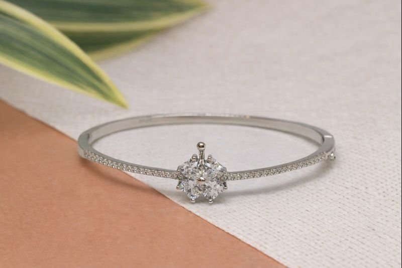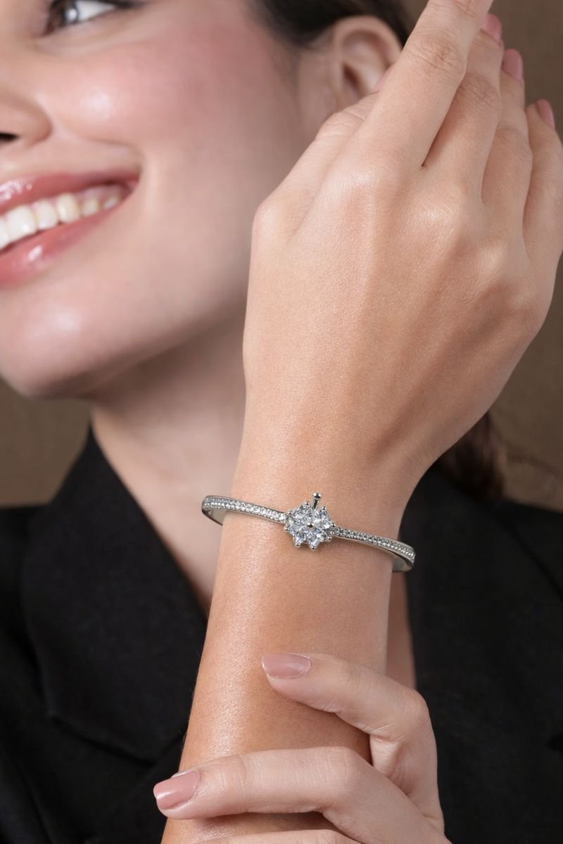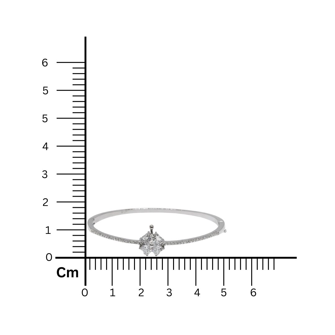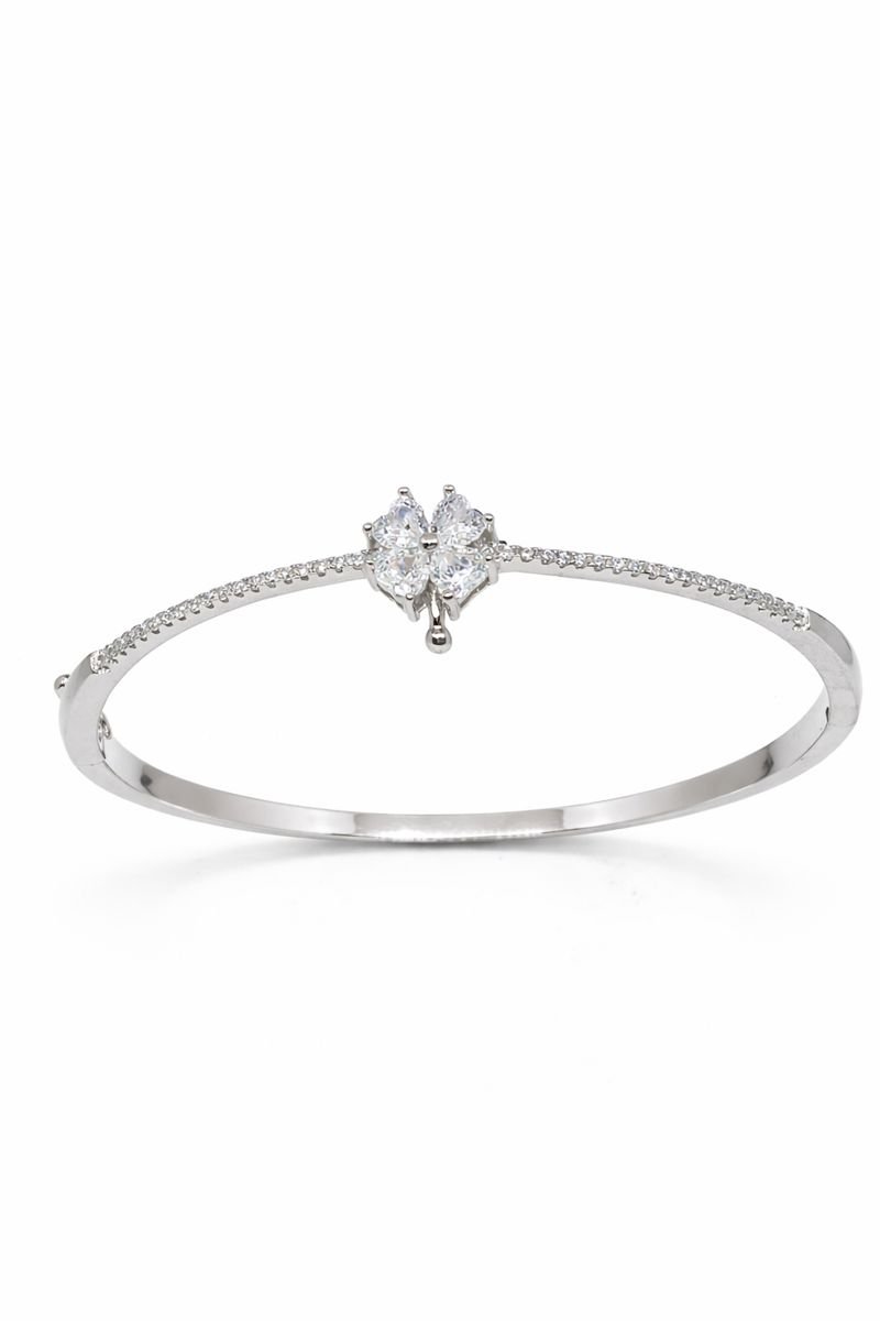 Adorn your wrist with this symbol of luck and elegance. This 925 Sterling Silver bangle features a charming four-leaf clover (or floral) centerpiece, composed of four heart-shaped White American Diamonds clustered together. A unique silver detail accents the top of the bloom, adding a touch of whimsy. The slender band is lined with shimmering pave-set stones along the upper curve, leading gracefully to the central motif. Crafted with a secure hinge and clasp mechanism, this oval bracelet offers a comfortable fit for daily wear. Weighing 11.53 grams, it is a perfect gift of fortune and style.
