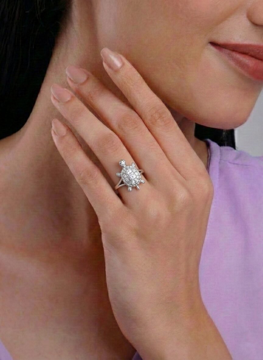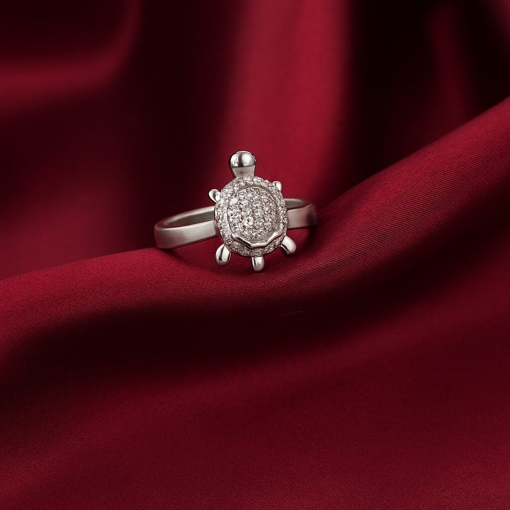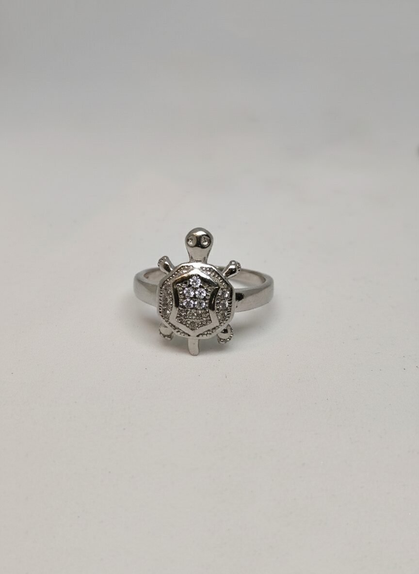 Invite good fortune and stability into your life with this auspicious 925 Sterling Silver Tortoise ring (also known as a Meru or Kachua ring). The design features a beautifully detailed turtle motif, with the shell intricately paved in sparkling White American Diamonds. Weighing 2.85 grams, this ring is not only a stylish accessory but also a traditional symbol of longevity, wealth, and protection.