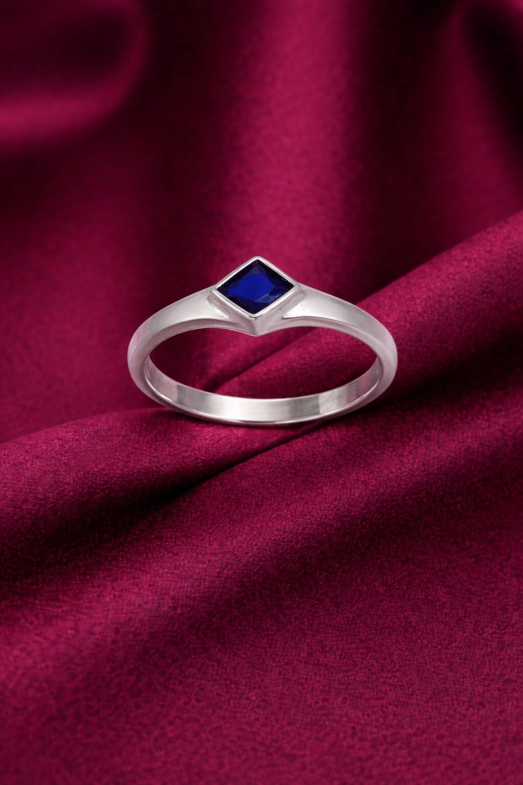 Showcase modern geometry with this sleek 925 Sterling Silver ring. The design highlights a deep Royal Blue square-cut stone set in a unique kite or rhombus orientation, securely held in a smooth bezel setting. The polished band tapers gently towards the center, creating a clean and contemporary silhouette. Weighing 1.92 grams, this lightweight ring adds a subtle yet striking pop of color to any outfit.