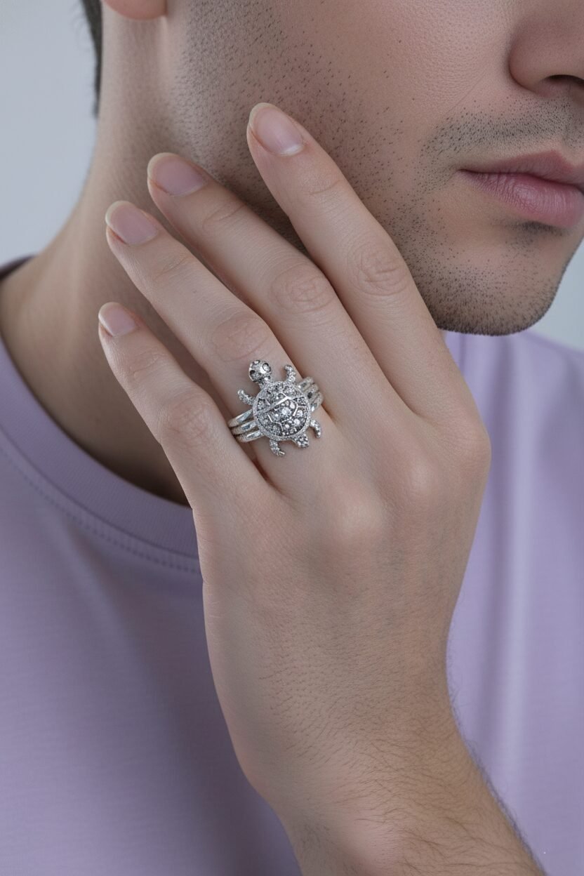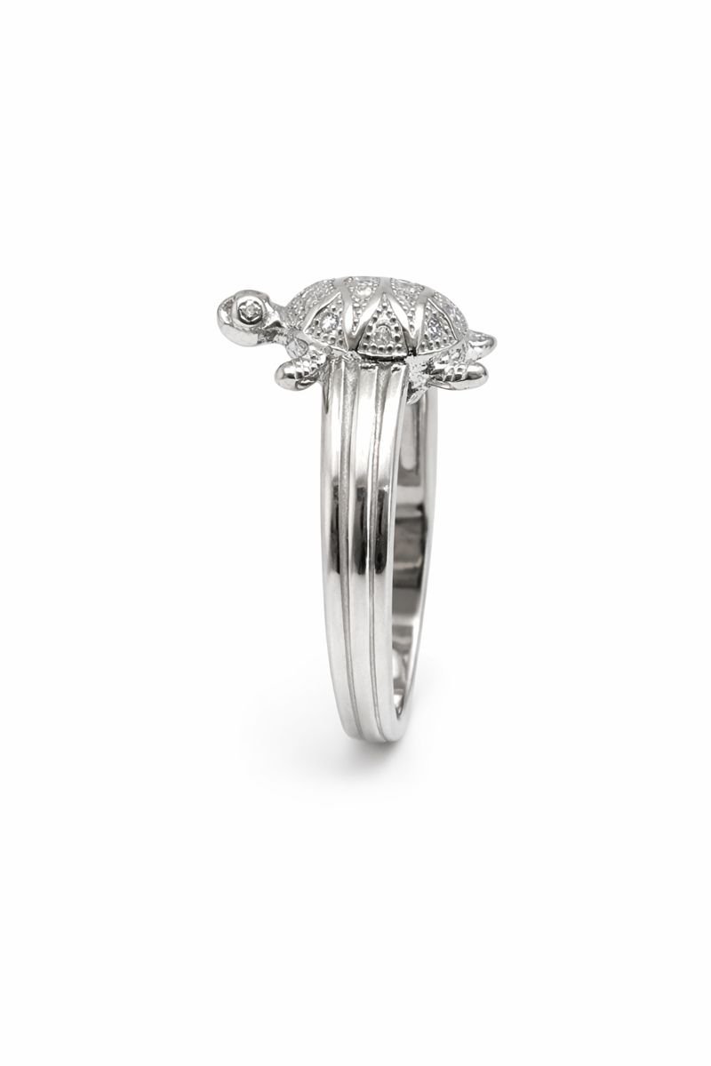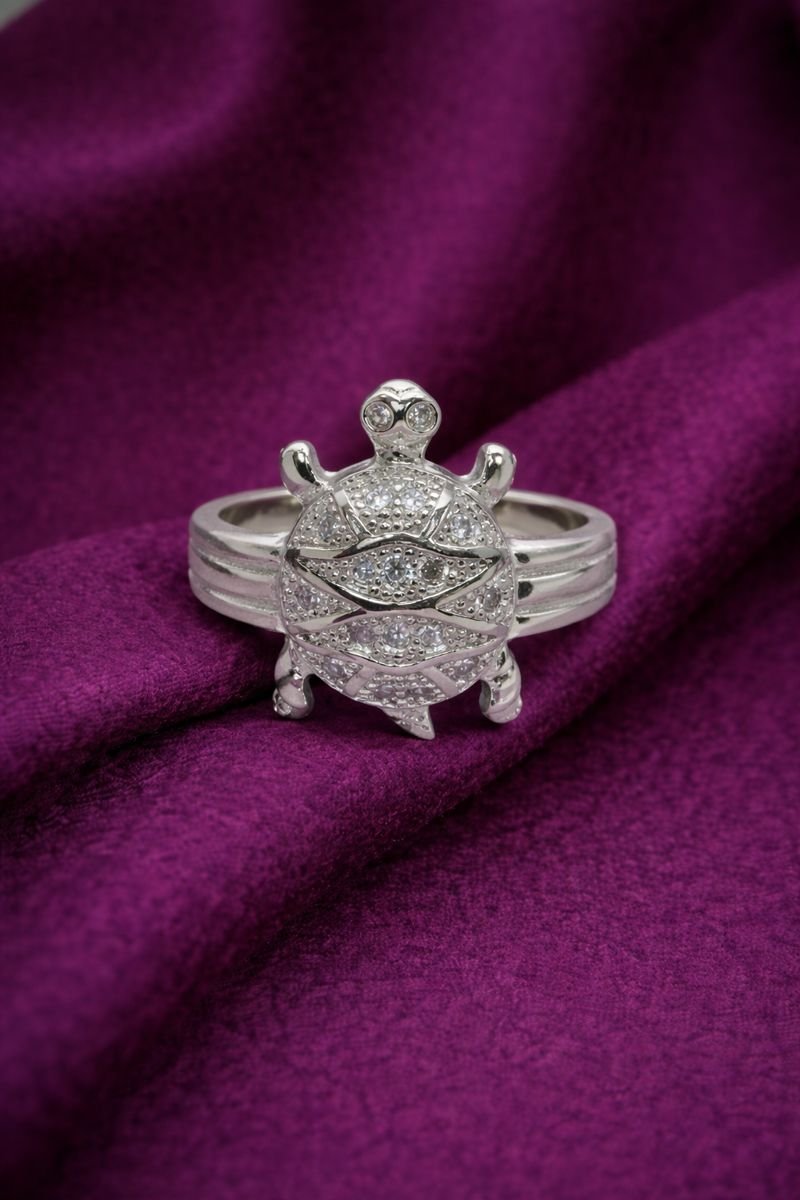 Channel positive energy and abundance with this exquisite 925 Sterling Silver Tortoise ring (Meru ring). The design showcases a fully paved shell, intricately set with sparkling White American Diamonds, creating a radiant and detailed focal point. The sturdy band features triple-grooved detailing on the shoulders, adding a touch of masculine elegance to this powerful lucky charm. Weighing 5.20 grams, this substantial ring is perfect for men or those seeking a statement piece for success and stability.