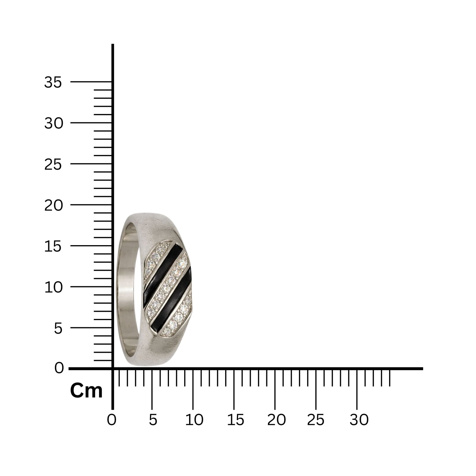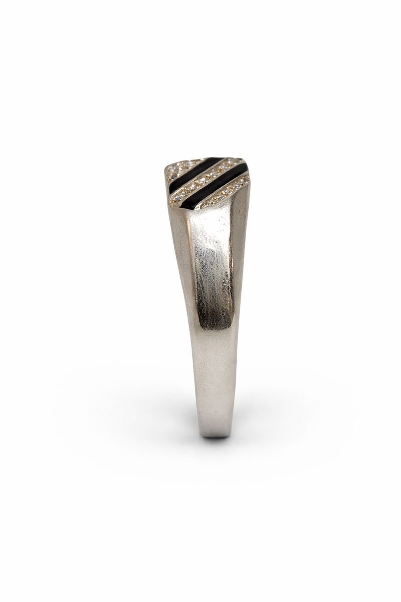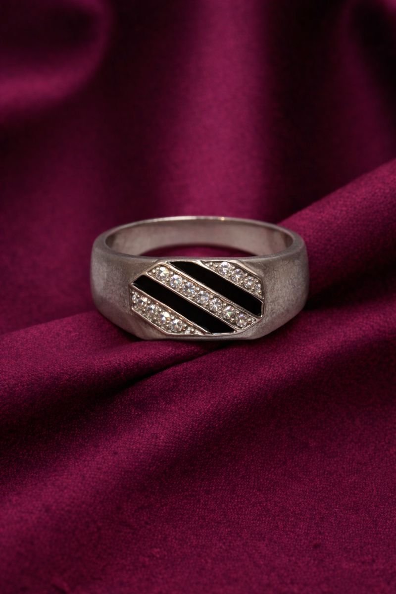 Elevate your everyday style with this streamlined 925 Sterling Silver ring. The design features a modern diagonal motif with alternating stripes of smooth black inlay (enamel or onyx) and rows of sparkling pave-set White American Diamonds. This high-contrast black and white pattern sits flush against the polished silver band, creating a smooth, snag-free profile that is perfect for daily wear. Weighing 4.40 grams, this ring offers a contemporary and sophisticated aesthetic.