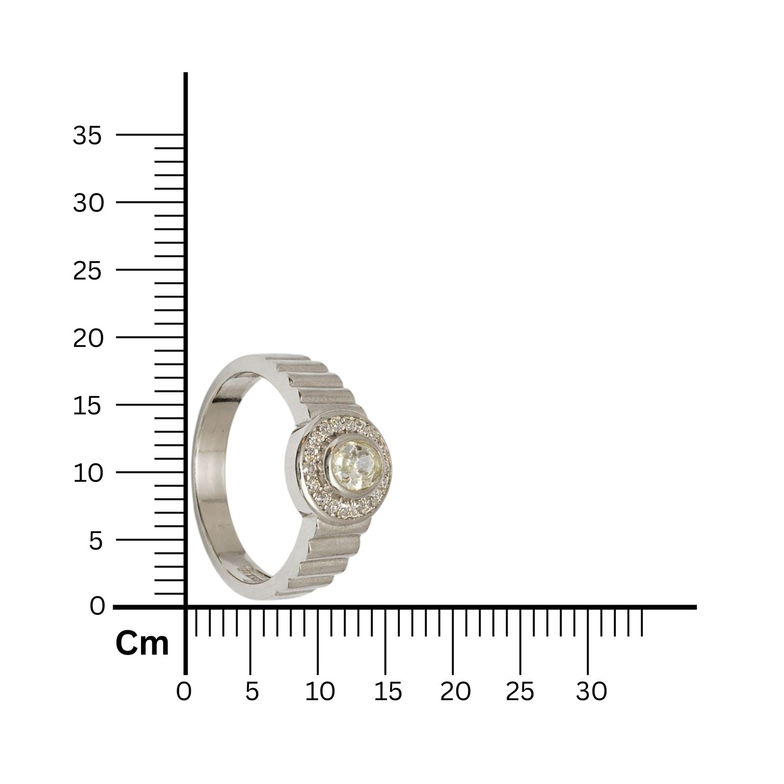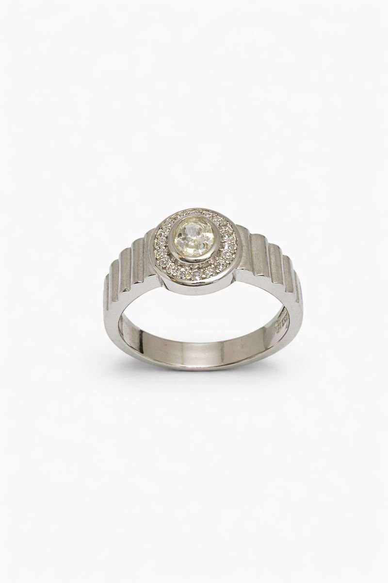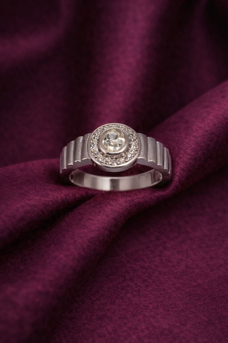 exude modern refinement with this structured 925 Sterling Silver ring. The focal point is a brilliant oval-cut White American Diamond, surrounded by a shimmering halo of smaller round stones, creating a classic cluster effect. The band sets this piece apart with its distinct vertical grooved or ribbed texturing (fluted shank) on the shoulders, adding an industrial and masculine touch to the design. Weighing 4.70 grams, this ring balances elegance with a bold, contemporary profile.