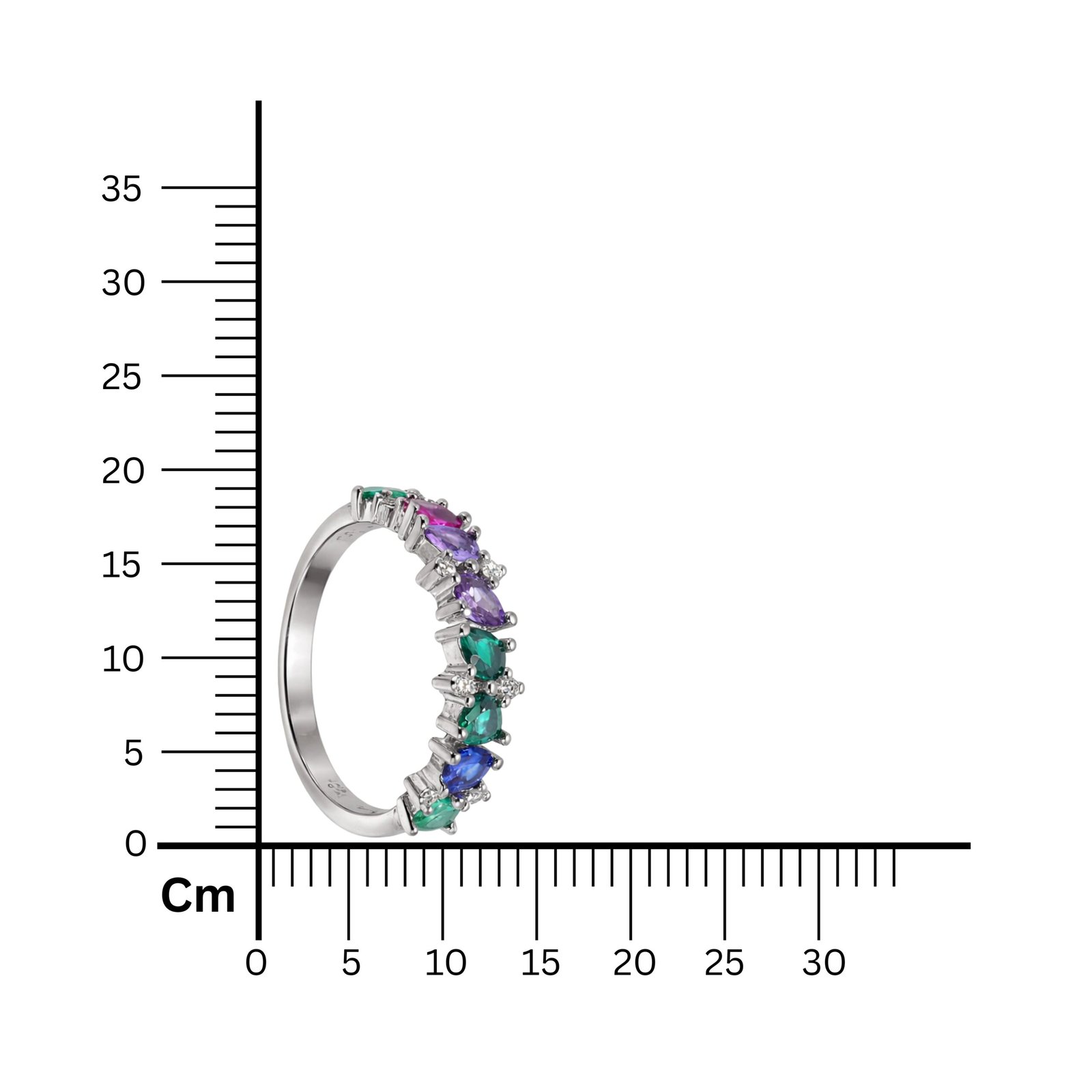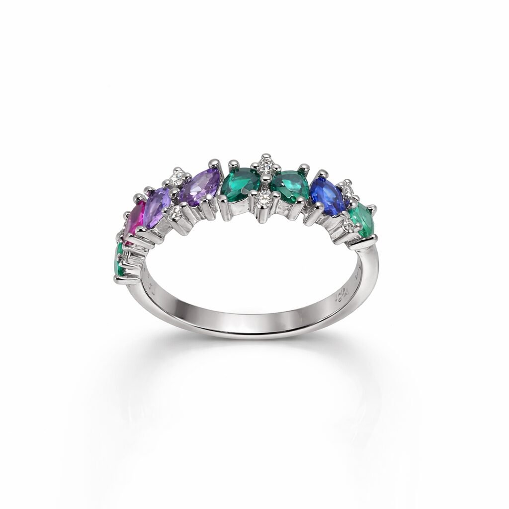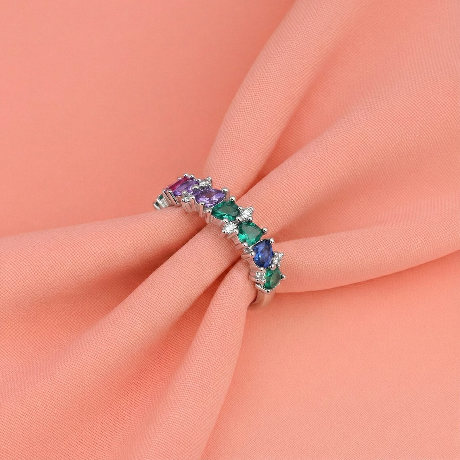 Bring a touch of joy and vibrancy to your style with this exquisite 925 Sterling Silver ring. The band features a stunning row of marquise-cut stones in rich shades of purple, green, and blue, accented by delicate white crystals for extra sparkle. Weighing 2.28 grams, this colorful ring is perfect for stacking or wearing as a cheerful daily accessory.