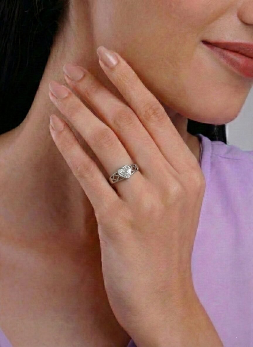 Sweet 925 Sterling Silver Heart Solitaire Ring with Filigree Band | Romantic Finger Ring for Women (Size 10)